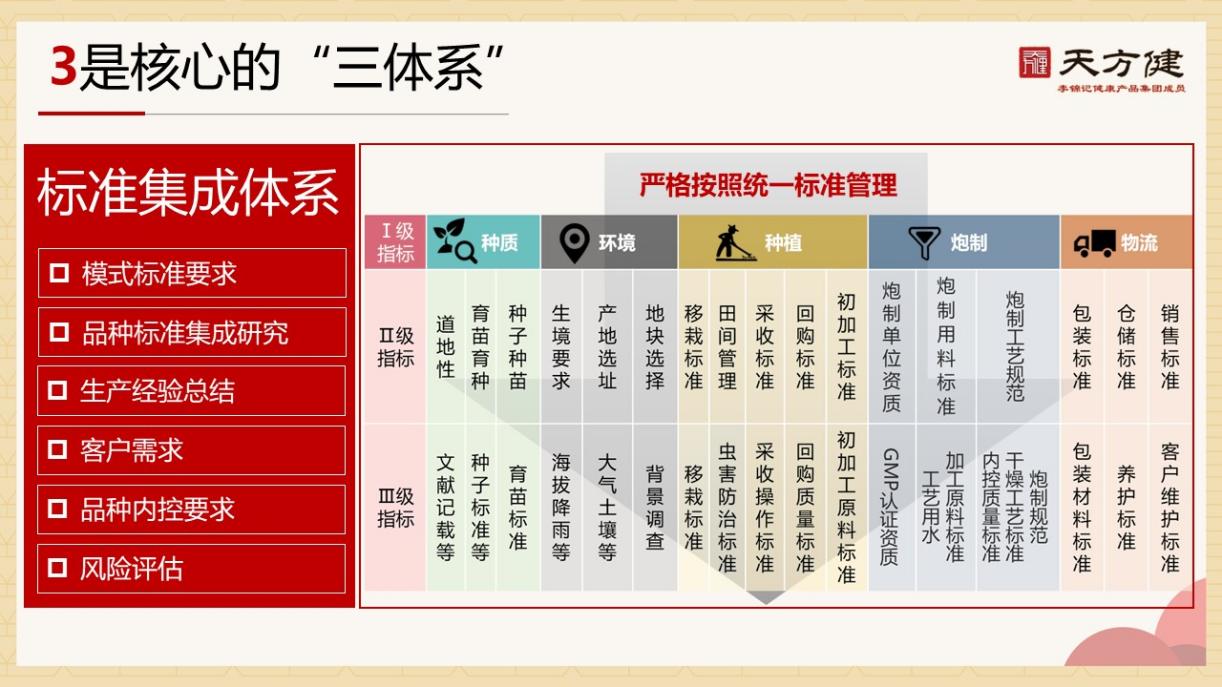 天方健種植管理模式由3+4+5組成。就是三體系、四創(chuàng)新、五統(tǒng)一,這是一整套非常完整、立體的管理體系,從各個方面有力地保障種植管理模式的效果。以三體系為例,三體系包含了標(biāo)準(zhǔn)集成體系、生產(chǎn)運(yùn)作體系、質(zhì)量監(jiān)控體系。其中,標(biāo)準(zhǔn)集成體系把種質(zhì)、環(huán)境、種植、炮制、物流,分為1級指標(biāo)、2級指標(biāo)、3級指標(biāo),嚴(yán)格按照統(tǒng)一標(biāo)準(zhǔn)管理。以環(huán)境指標(biāo)為例,對生態(tài)、產(chǎn)地、地塊都有嚴(yán)格的要求,包括海拔降雨、大氣土壤等等。
